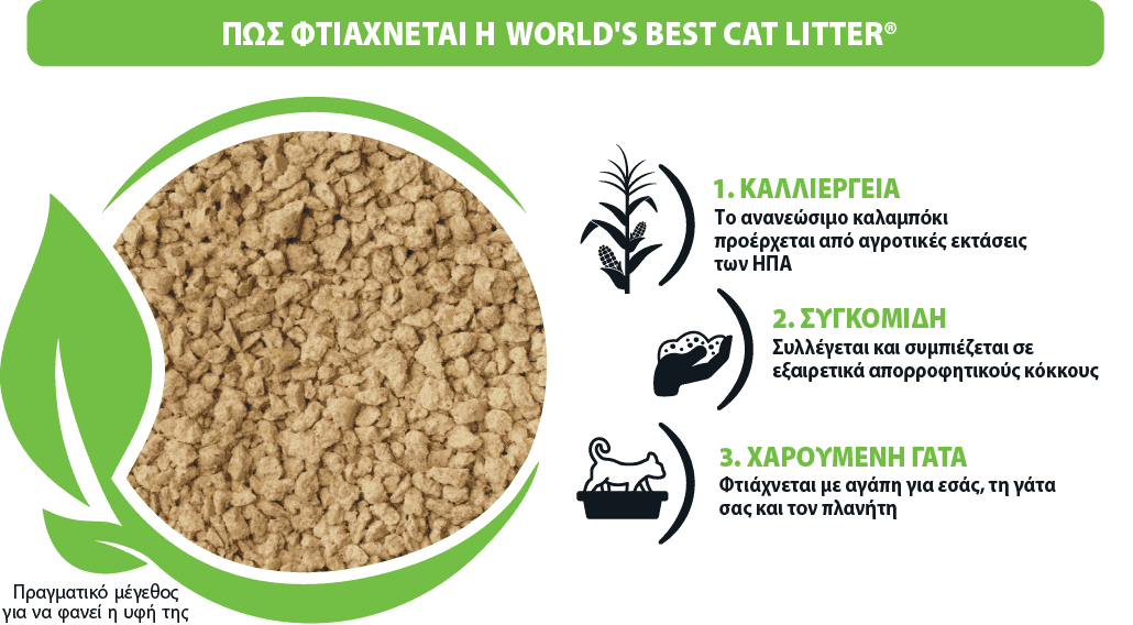 Αυτή η άμμος υγιεινής με σχηματισμό σβόλων για πολλές γάτες παράγεται με ένα φυσικό φυτικό συστατικό για ακόμα καλύτερο έλεγχο των οσμών, είναι εύκολη στο καθάρισμα με φτυαράκι και έχει αποδειχτεί ότι μπορεί να απορριφθεί στο δίκτυο αποχέτευσης* για ευκολία κατά το καθάρισμα! Το να έχετε πάνω από μία γάτες δεν πρέπει να σημαίνει περισσότερες ανησυχίες. Οι γάτες σας αξίζουν την καλύτερη άμμο υγιεινής για σχηματισμό σβόλων. Αξιοποιήστε περισσότερο κάθε σακούλα, αφού έχει διπλάσια χρονική διάρκεια σε σύγκριση με την πρώτη μάρκα άμμου υγιεινής στις ΗΠΑ.
